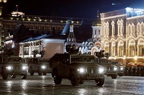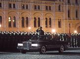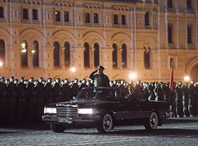 Ночная совместная репетиция пешей и механизированной колонн парадного расчета по подготовке к военному параду, посвященного 71-й годовщине Победы в Великой Отечественной войне, на Красной площади. Автомобиль министра обороны России на репетиции.