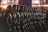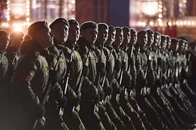Ночная совместная репетиция пешей и механизированной колонн парадного расчета по подготовке к военному параду, посвященного 71-й годовщине Победы в Великой Отечественной войне, на Красной площади. Колонна военнослужащих Воздушно-десантных войск (ВДВ) ВС России.