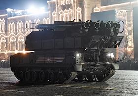 Ночная совместная репетиция пешей и механизированной колонн парадного расчета по подготовке к военному параду, посвященного 71-й годовщине Победы в Великой Отечественной войне, на Красной площади. Проезд зенитно-ракетного комплекса "БУК-М2".