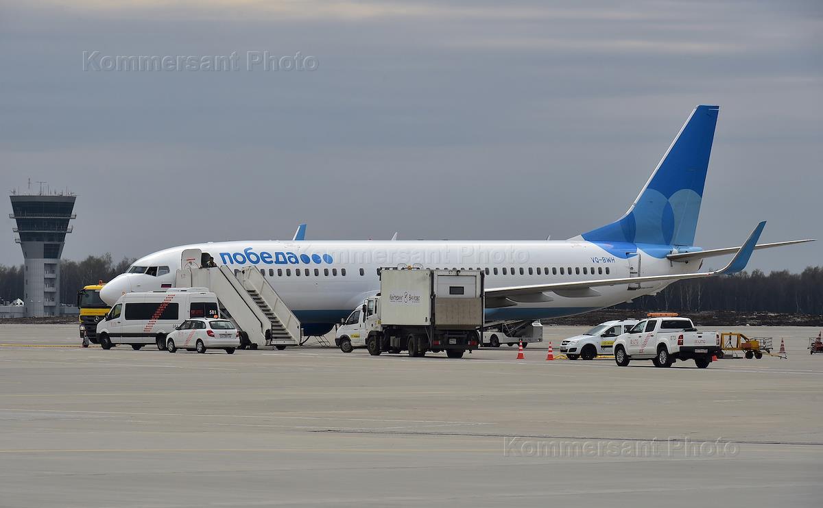 Aircraft of the airline company 'Pobeda' (lowcoster of the group 'Aeroflot'), based in the airport 'Vnukovo'. Passengers are flying to Sochi.