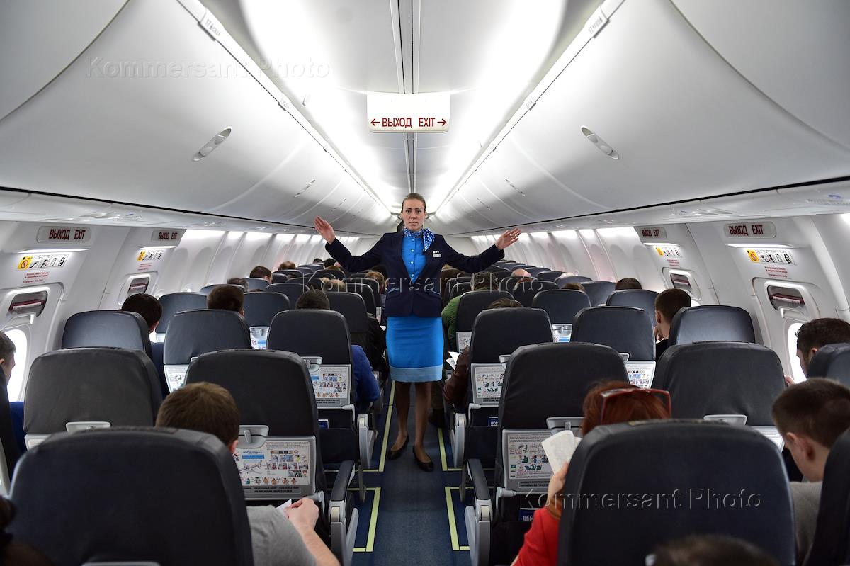 Самолет авиакомпании "Победа" (лоукостер Группы "Аэрофлот"), базирующейся в аэропорту "Внуково". Стюардесса во время инструктажа для пассажиров в салоне самолета перед полетом в город Сочи.