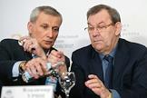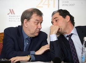 Генеральный директор Государственного академического Большого театра (ГАБТ) Владимир Урин (слева) и музыкальный руководитель-главный дирижер ГАБТ Туган Сохиев (справа) на пресс-конференции, посвященной планам Большого театра на 241-й сезон. Пресс-конференция прошла в ГАБТ.