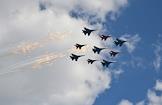 Генеральная репетиция военного Парада Победы прошла на Красной площади. Многоцелевые истребители Су-27 пилотажной группы "Русские Витязи" и МиГ-29 пилотажной группы "Стрижи".