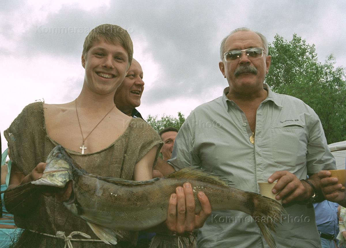 Chairman of the Russian Filmmakers' Union Nikita Mikhalkov (right) during his trip with collegues at Nizhny Novgorod. He drinks champaign from a big wooden ladle.