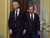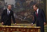 Министр иностранных дел (МИД) России Сергей Лавров (справа) и министр иностранных дел Словакии Мирослав Лайчак (слева) на встрече в Доме приемов МИД России.