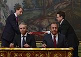 Министр иностранных дел (МИД) России Сергей Лавров (второй справа) и председатель правления ПАО "Газпром нефть" Александр Дюков (второй слева) во время церемонии подписания соглашения между МИД России и ПАО "Газпром нефть" о сотрудничестве. Подписание прошло в Доме приемов МИД России.