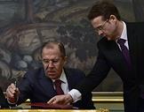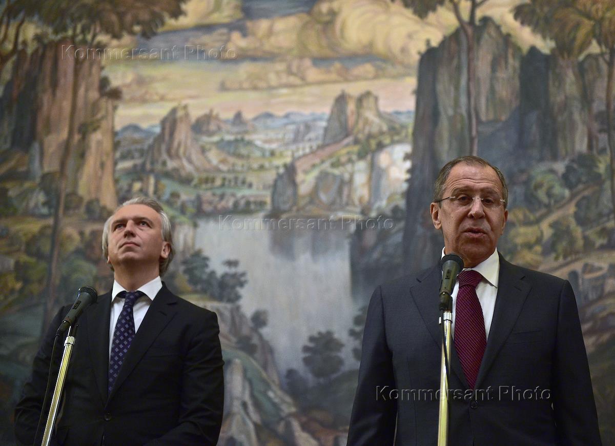 Министр иностранных дел (МИД) России Сергей Лавров (справа) и председатель правления ПАО "Газпром нефть" Александр Дюков (слева) во время пресс-конференции, посвященной подписания соглашения между МИД России и ПАО "Газпром нефть" о сотрудничестве. Подписание прошло в Доме приемов МИД России.