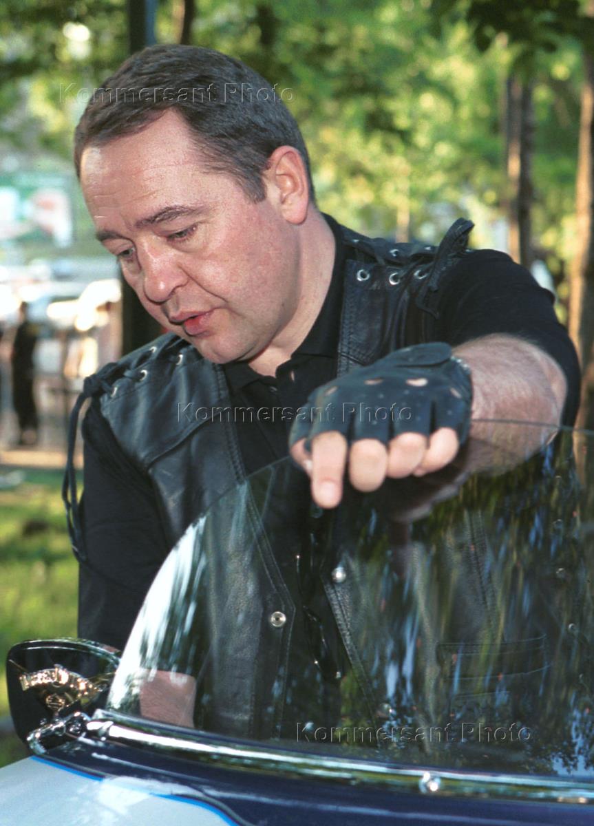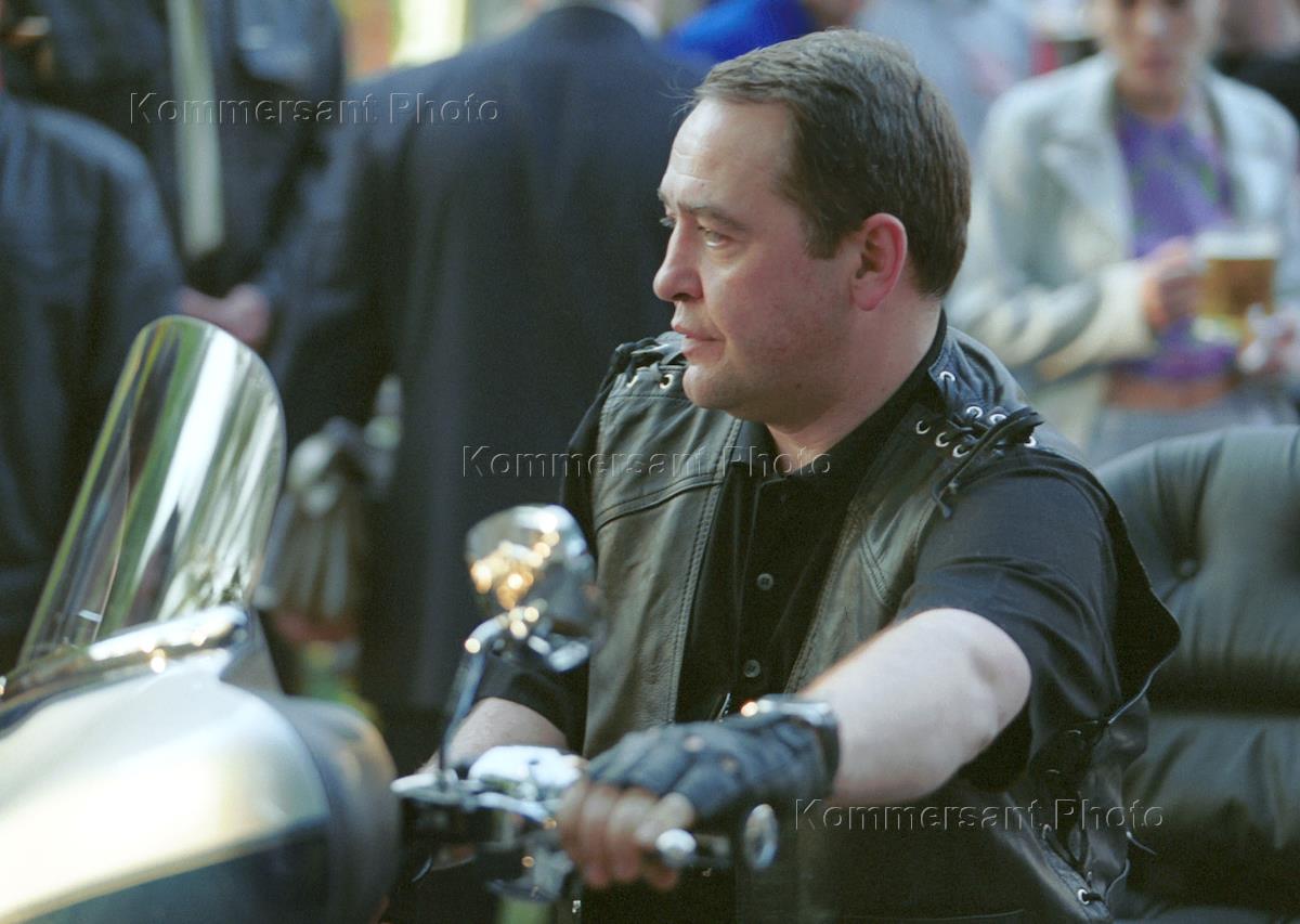 Министр печати России Михаил Лесин, в кожаном костюме на закрытом вечере, посвященном компании производящей мотоциклы "Харли Девидсон".