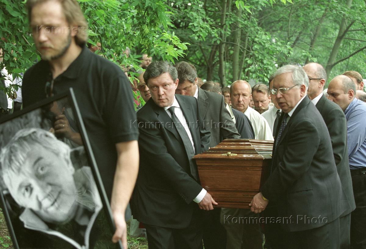 Руководитель фракции "Яблоко" Григорий Явлинский (второй слева) и заместитель председателя Государственной Думы России Владимир Лукин (справа) на похоронах известного журналиста, депутата Государственной Думы России от фракции "Яблоко" Юрия Щекочихина на кладбище писательского поселка "Переделкино".