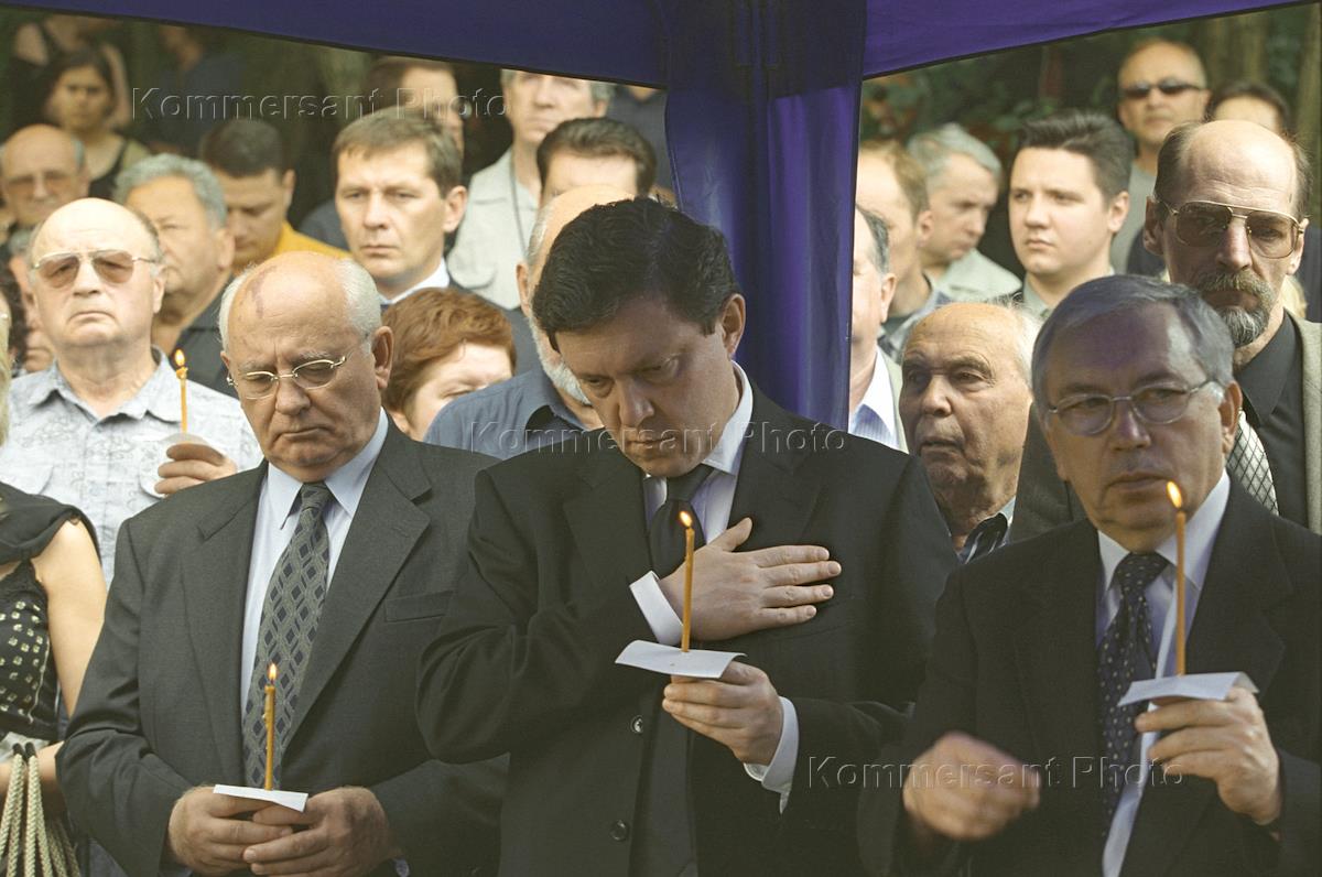 Первый Президент СССР, лидер Российской объединенной Социал-демократической партии Михаил Горбачев (слева), руководитель фракции "Яблоко" Григорий Явлинский (в центре) и заместитель председателя Государственной Думы России Владимир Лукин (справа) на гражданской панихиде по известному журналисту, депутату Государственной Думы России от фракции "Яблоко" Юрию Щекочихину в ритуальном зале ЦКБ. Юрий Щекочихин похоронен на кладбище писательского поселка "Переделкино" (Московская область).