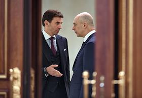 Министр России по связям с Открытым правительством Михаил Абызов (слева) и министр финансов России Антон Силуанов (справа) перед началом заседания правительства России.