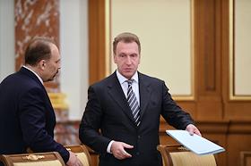 Министр строительства и жилищно-коммунального хозяйства России Михаил Мень (слева) и первый заместитель председателя правительства России Игорь Шувалов (справа) перед началом заседания правительства России.