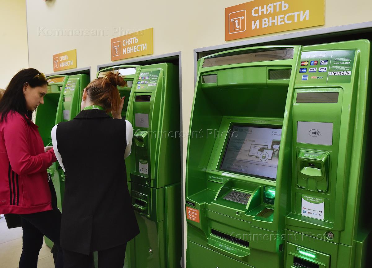 Жанровая фотография. Офис "Сбербанка России". Ряд банкоматов для снятия и внесения денег.