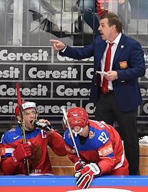 Чемпионат мира по хоккею. Групповой этап. Матч между сборными командами России и Швейцарии прошел на арене "ВТБ Ледовый дворец". Игрок сборной России Александр Овечкин (слева) и главный тренер сборной России Олег Знарок (справа) во время матча.