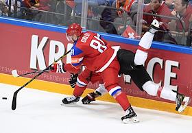 Чемпионат мира по хоккею. Групповой этап. Матч между сборными командами России и Швейцарии прошел на арене "ВТБ Ледовый дворец". Игрок сборной России Иван Телегин (справа) во время матча.