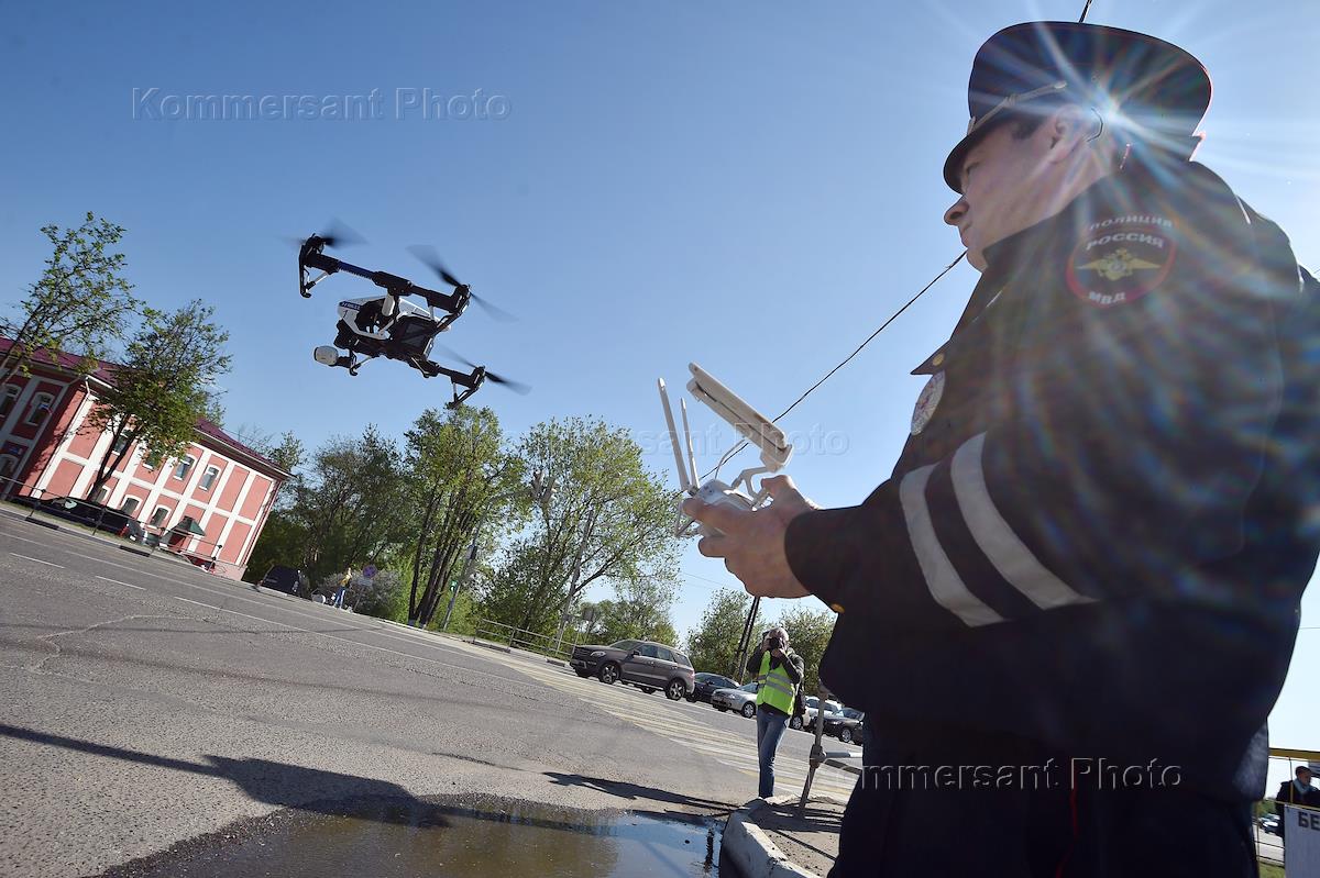 Инструктаж личного состава мотовзвода ДПС перед проведением профилактического рейда по выявлению нарушений, совершаемых водителями двухколесного транспорта, на территории 1 полка ДПС ГИБДД ГУ МВД России по Московской области. Запуск квадрокоптера сотрудниками ДПС.