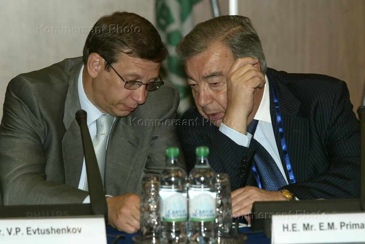 Chairman of the Board of Directors of the Financial Corporation "Sistema", Evtushenkov Vladimir (left) and President of the Russian Trade Industrial Palace Evgeny Primakov (right) attend the Russian-Saudi business-forum.