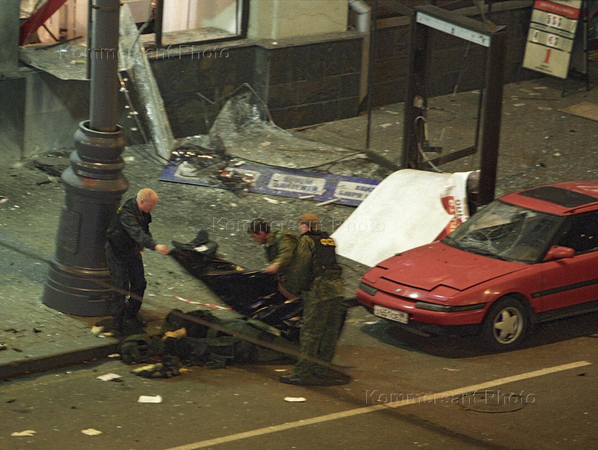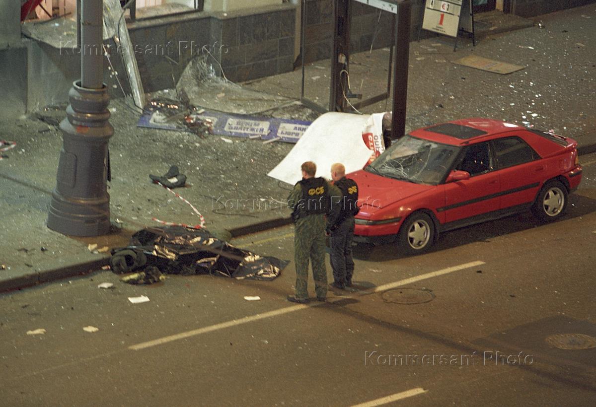 Место гибели старшего эксперта-взрывотехника Института криминалистики при ФСБ, майора Георгия Трофимова. Трофимов погиб во время обезвреживания взрывного устройства около здания ресторана "Имбирь" по улице Тверской - Ямской. Ресторан пыталась взорвать "черная вдова" - 23-летняя чеченка Зарима Мужахоева. Последствия взрыва на улице.
