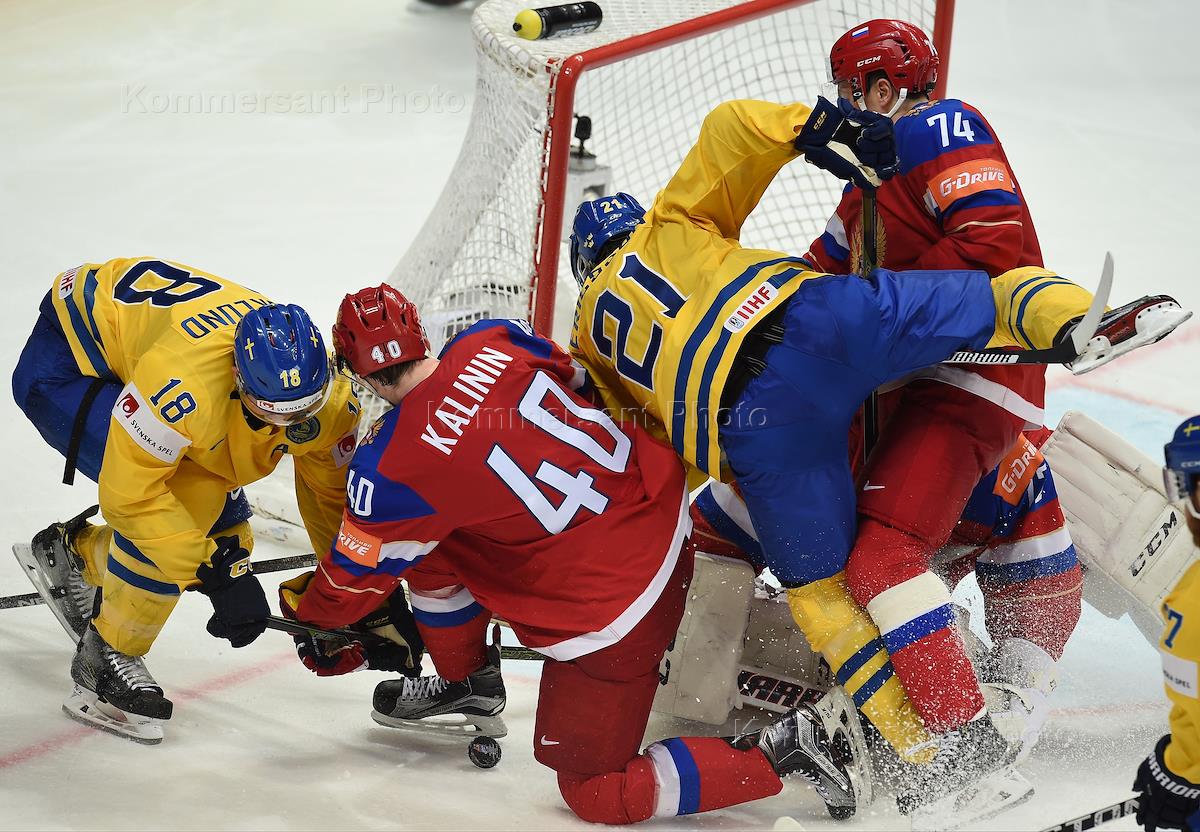 Чемпионат мира по хоккею. Групповой этап. Матч между сборными командами России и Швеции на арене "ВТБ Ледовый дворец". Вратарь сборной Швеции Якоб Маркстрём (в центре) и игрок сборной России Евгений Дадонов (справа) во время матча.