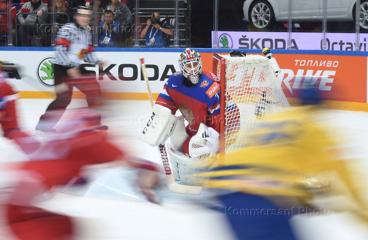 Чемпионат мира по хоккею 2016. Групповой этап. Матч между сборными командами России и Швеции прошел на арене "ВТБ Ледовый дворец". Вратарь сборной Швеции Якоб Маркстрём (слева) во время матча.