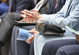VI Петербургский Международный юридический форум. Пленарное заседание "Доверие к праву – путь разрешения глобальных кризисов" в здании Генерального штаба. Жанровая фотография. Женщина с мобильным телефоном, сумкой и часами.