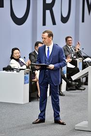 VI Петербургский Международный Юридический Форум. Председатель правительства России Дмитрий Медведев во время пленарного заседания "Доверие к праву – путь разрешения глобальных кризисов". Заседание прошло в здании Генерального штаба.
