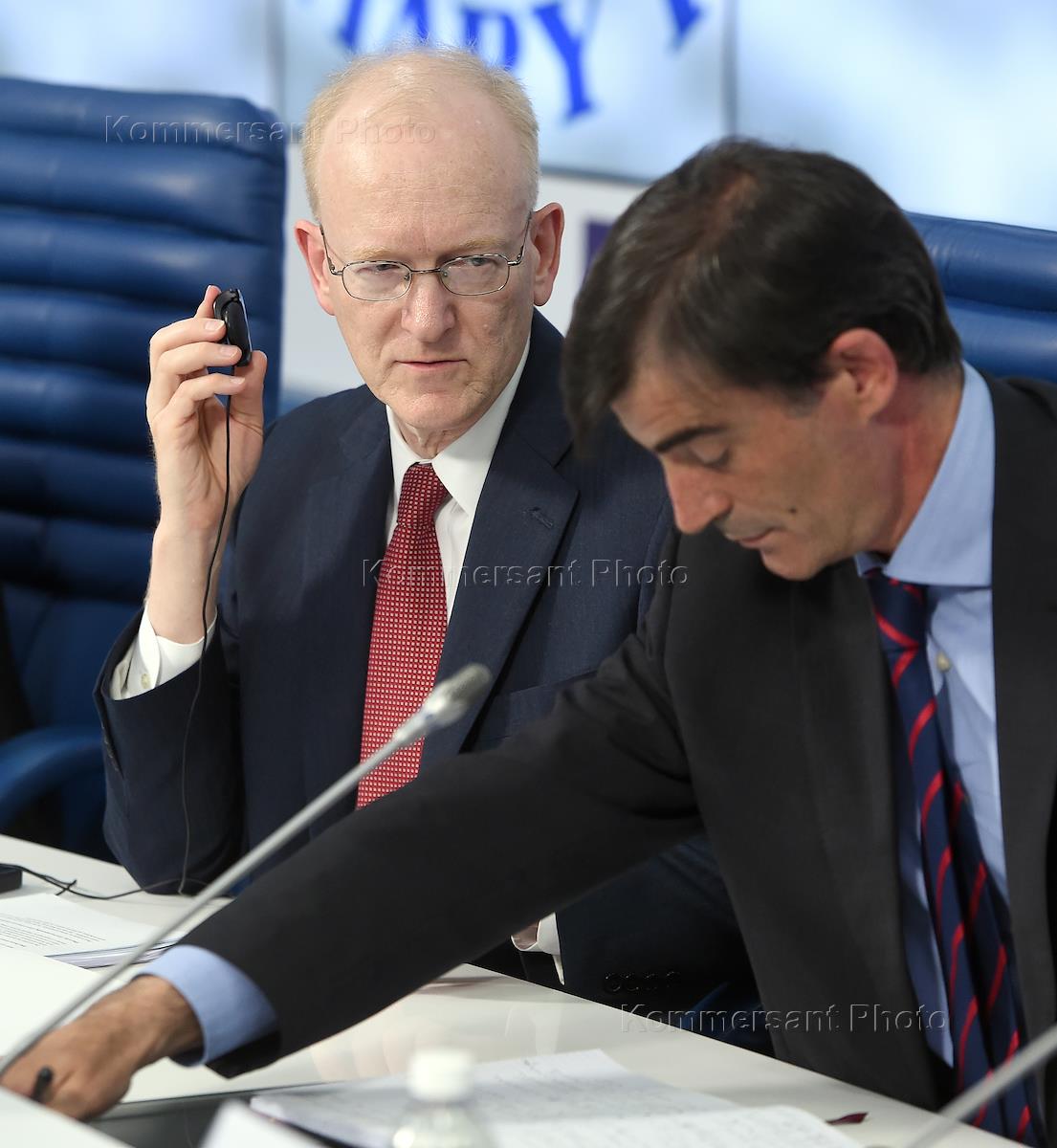 Руководитель миссии МВФ по оценке стабильности финансового сектора Карл Хабермейер (слева) и руководитель миссии МВФ по России Эрнесто Рамирес Риго (справа) на пресс-конференции, посвященной результатам работы миссий МВФ по макроэкономической политике (IV статья) и по оценке стабильности финансового сектора России. Пресс-конференция прошла в агентстве в ТАССе.