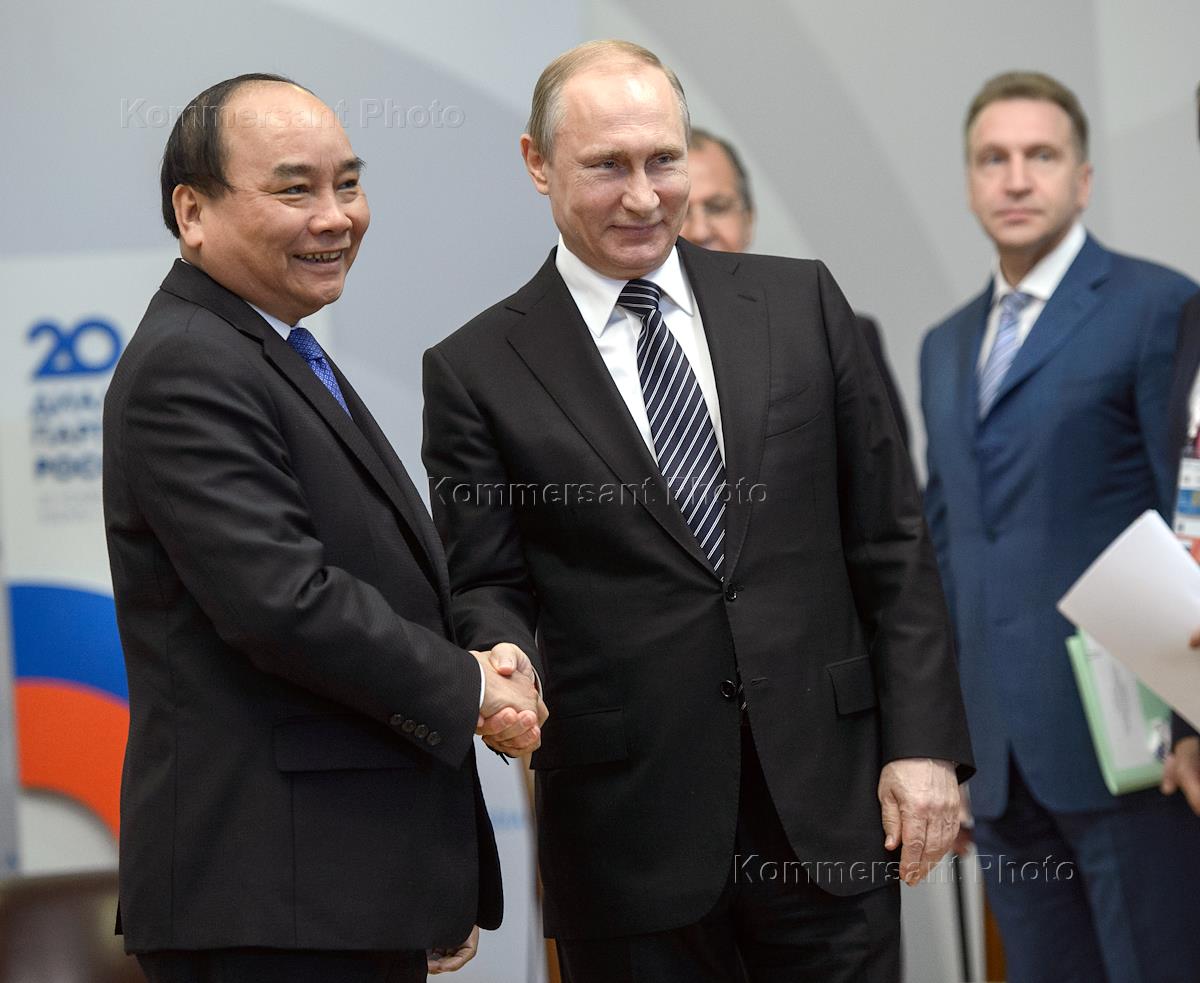 Рабочая поездка президента России Владимира Путина в Сочи. Саммит Россия - АСЕАН. Президент России Владимир Путин (в центре) и премьер-министр Вьетнама Нгуен Суан Фук (слева) во время встречи в конгресс-центре гостиницы "Рэдиссон Блю Курорт".