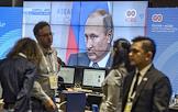 Рабочая поездка президента России Владимира Путина в Сочи. Саммит Россия - АСЕАН. Президент России Владимир Путин (на экране телевизора) в конгресс-центре гостиницы "Рэдиссон Блю Курорт".