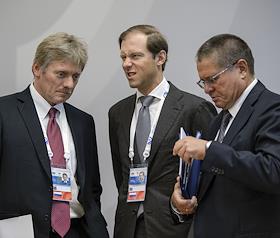 Рабочая поездка президента России Владимира Путина в Сочи. Саммит Россия - АСЕАН. Слева направо: заместитель руководителя администрации президента России, пресс-секретарь президента Дмитрий Песков, министр промышленности и торговли России Денис Мантуров и министр экономического развития России Алексей Улюкаев во время встречи с премьер-министром Малайзии Н.Тун.Разаком в конгресс-центре гостиницы "Рэдиссон Блю Курорт".