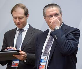 Рабочая поездка президента России Владимира Путина в Сочи. Саммит Россия - АСЕАН. Министр промышленности и торговли России Денис Мантуров (слева) и министр экономического развития России Алексей Улюкаев (справа) во время встречи с премьер-министром Малайзии Н.Тун.Разаком в конгресс-центре гостиницы "Рэдиссон Блю Курорт".