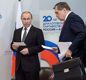 Рабочая поездка президента России Владимира Путина в Сочи. Саммит Россия - АСЕАН. Президент России Владимир Путин (слева) и его помощник Юрий Ушаков (справа) перед началом встречи с президентом Мьянмы Т.Чжо в конгресс-центре гостиницы "Рэдиссон Блю Курорт" .