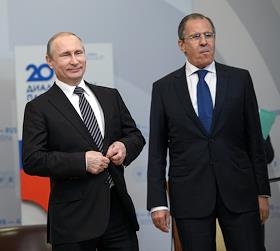 Рабочая поездка президента России Владимира Путина в Сочи. Саммит Россия - АСЕАН. Президент России Владимир Путин (слева) и министр иностранных дел России Сергей Лавров (справа) перед началом встречи с премьер-министром Камбоджи Хун Сеном в конгресс-центре гостиницы "Рэдиссон Блю Курорт" .
