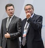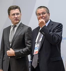 Рабочая поездка президента России Владимира Путина в Сочи. Саммит Россия - АСЕАН. Министр энергетики России Александр Новак (слева) и министр экономического развития России Алексей Улюкаев (справа) во время встречи с премьер-министром Малайзии Н.Тун.Разаком в конгресс-центре гостиницы "Рэдиссон Блю Курорт".