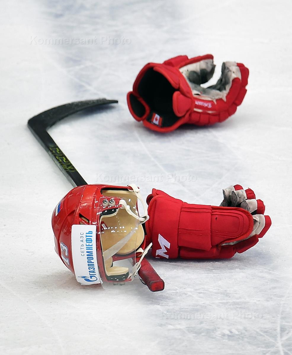 Чемпионат мира по хоккею. Матч за третье место. Матч между сборными командами России и Америки прошле на арене "ВТБ Ледовый дворец". Шлем, клющка и перчатки на льду.