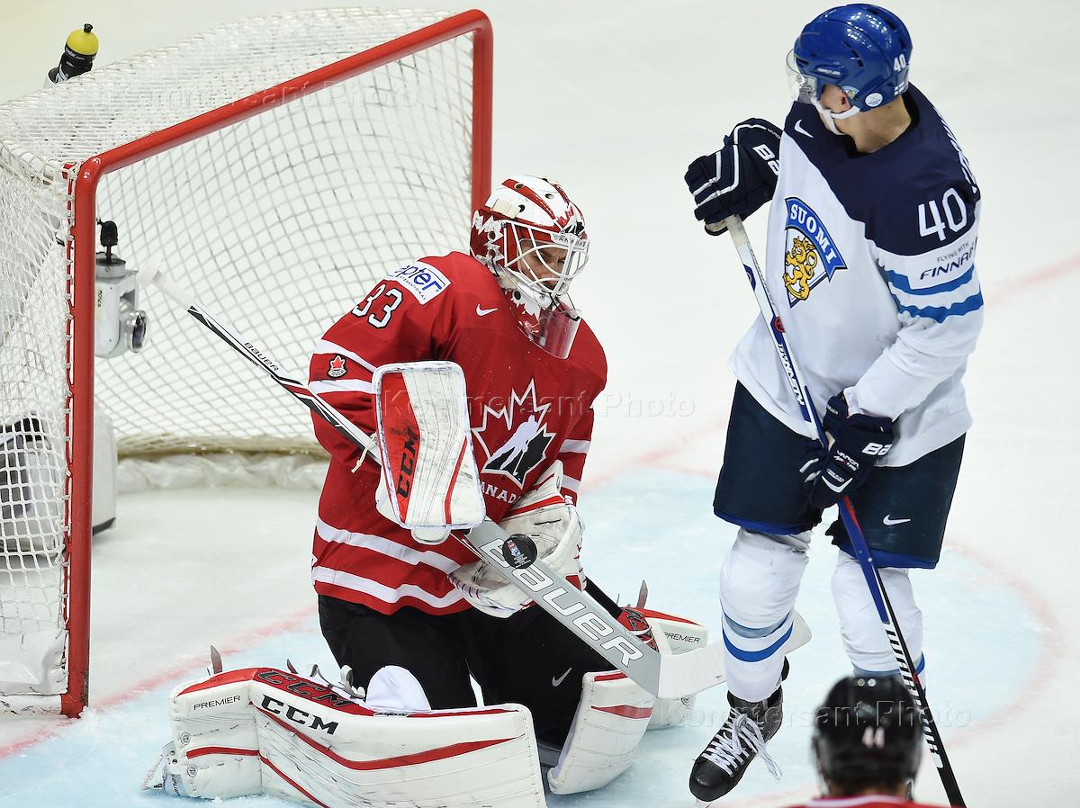 Чемпионат мира по хоккею. Финал. Матч между сборными Финляндиии и Канады прошел на арене "ВТБ Ледовый дворец". Вратарь сборной Канады Кэм Тальбо (слева) и игрок сборной Финляндии Патрик Лайне (справа) во время матча.
