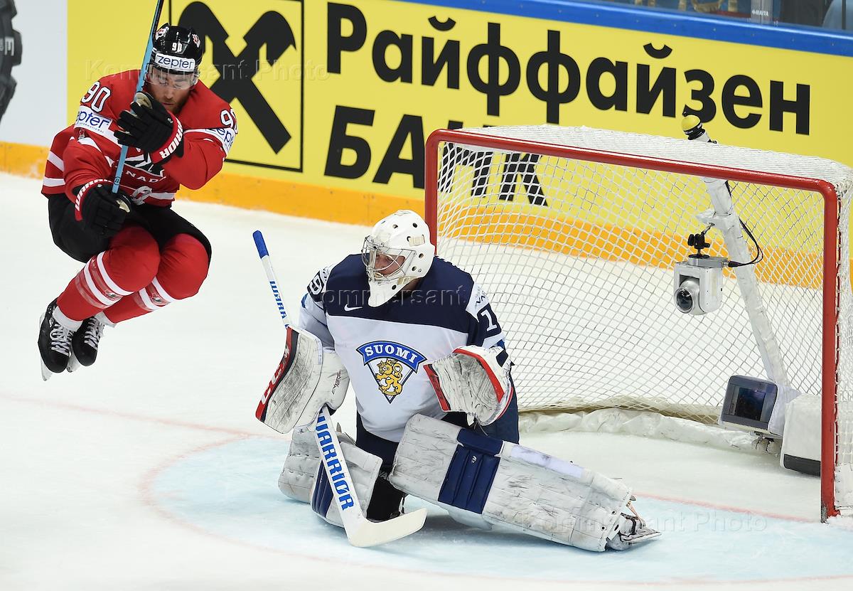 Чемпионат мира по хоккею. Финал. Матч между сборными Финляндиии и Канады прошел на арене "ВТБ Ледовый дворец". Вратарь сборной Финляндии Микко Коскинен (справа) и игрок сборной Канады Кори Перри (слева) во время матча.