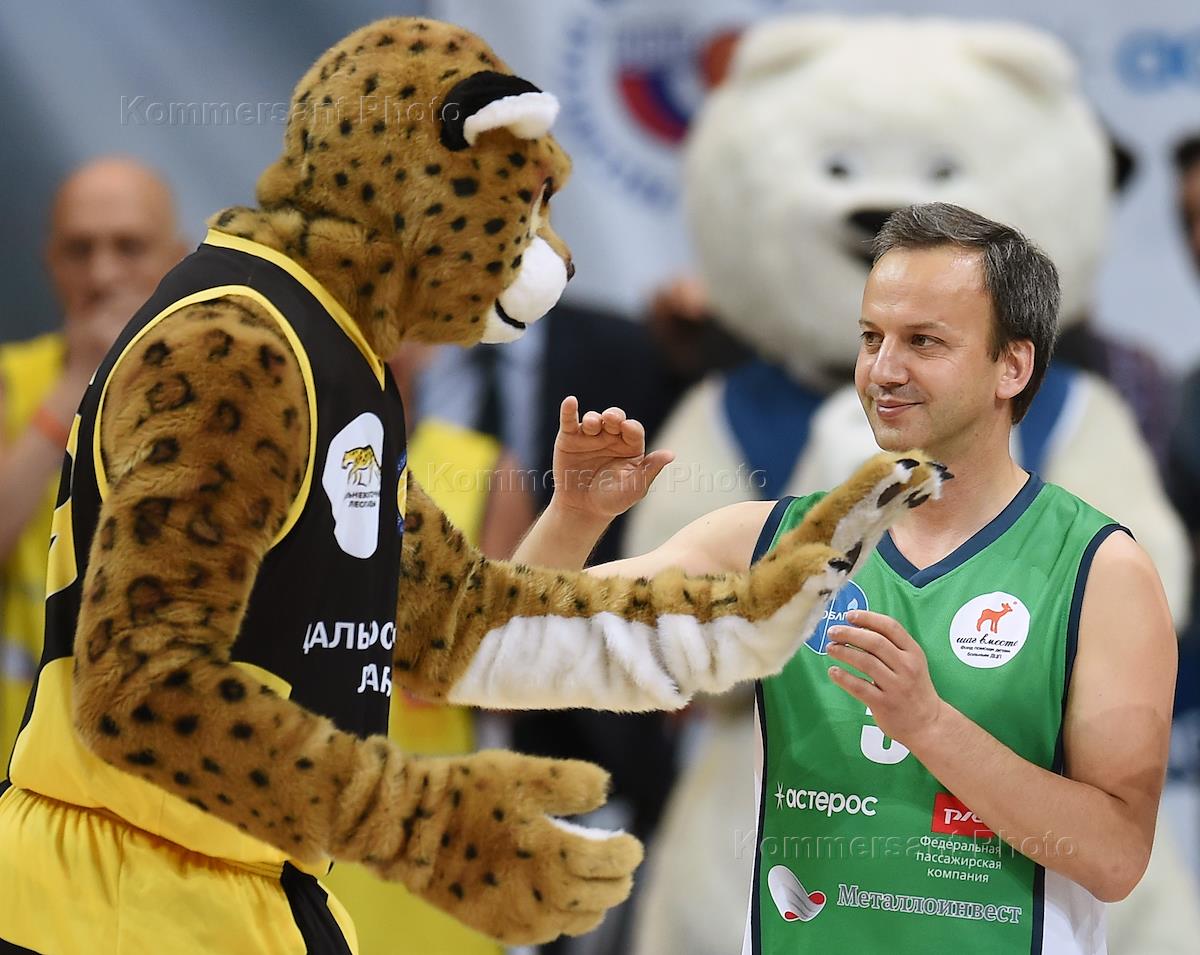 IV Благотворительный матч по баскетболу, организованный благотворительным фондом "Шаг вместе". Заместитель председателя правительства России Аркадий Дворкович (слева) на матче во Дворце спорта "Динамо" в Крылатском .