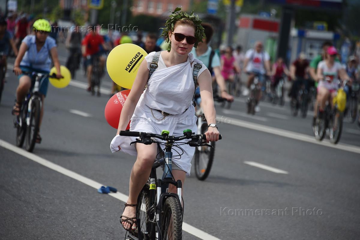 Участники Московского велопарада по Садовому кольцу отдыхают на траве газона.