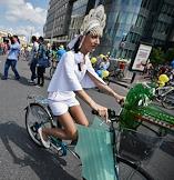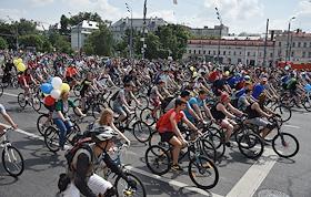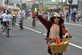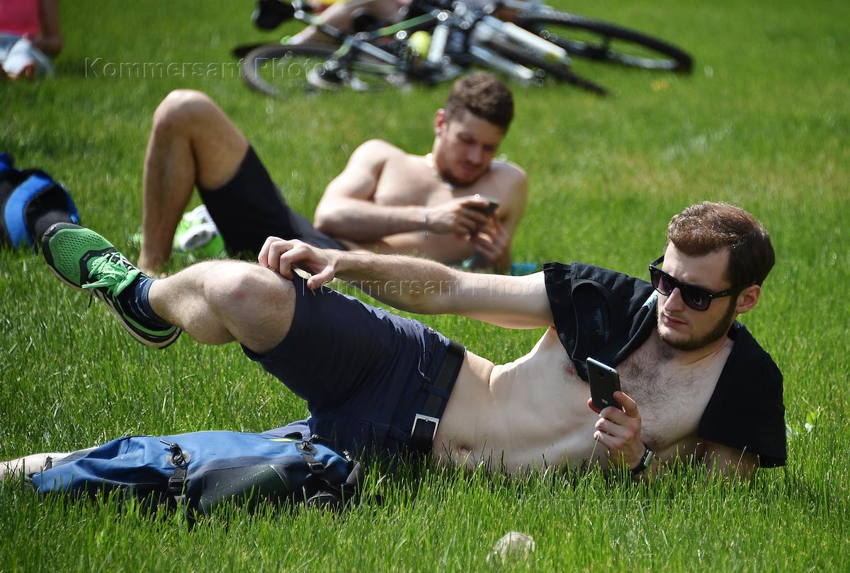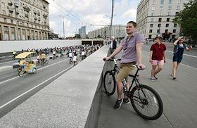 Участники Московского велопарада по Садовому кольцу отдыхают на траве газона.