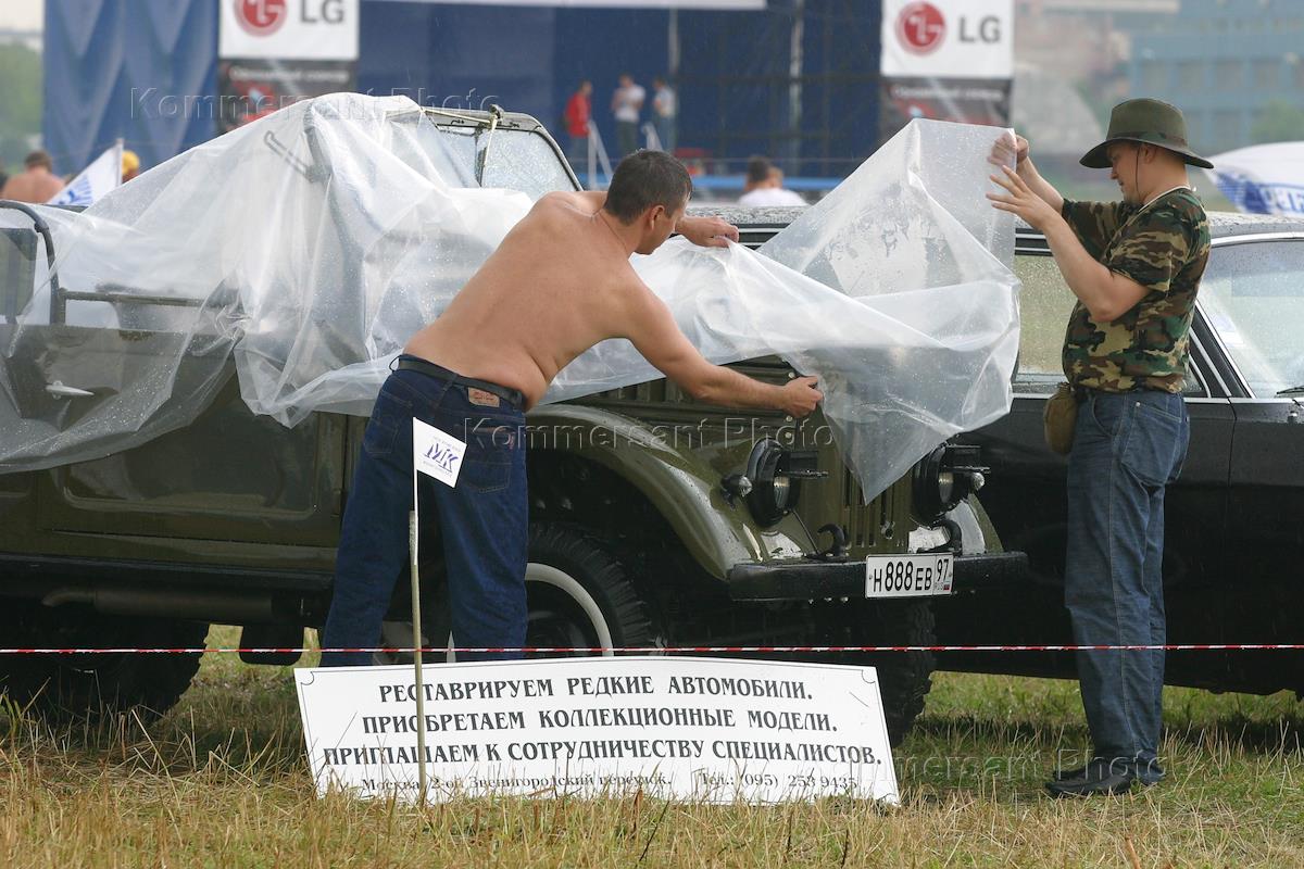 Exotica 2003 VII Festival of exotic and antique cars at the Tushino airfield. Participants of the festival cover a car from the rain.