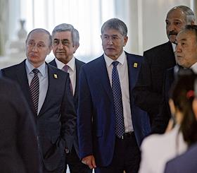 Рабочая поездка президента России Владимира Путина в Астану. Слева направо: президент России Владимир Путин, президент Армении Серж Саргсян, президент Киргизской Республики Алмазбек Атамбаев, президент Белоруссии Александр Лукашенко, президент Казахстана Нурсултан Назарбаев перед началом заседания Высшего Евразийского экономического совета на уровне глав государств в расширенном составе.