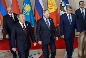 Рабочая поездка президента России Владимира Путина в Астану. Слева направо: президент Белоруссии Александр Лукашенко, президент Казахстана Нурсултан Назарбаев, президент России Владимир Путин, президент Киргизии Алмазбек Атамбаев и председатель коллегии Евразийской экономической комиссии (ЕЭК) Тигран Саркисян во время совместного фотографирования в рамках Высшего Евразийского экономического совета в президентском дворце "Акорда".