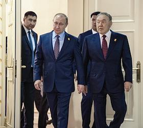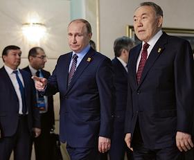 Рабочая поездка президента России Владимира Путина в Астану. Президент Казахстана Нурсултан Назарбаев (слева) и президент России Владимир Путин (справа) перед началом заседание Высшего Евразийского экономического совета на уровне глав государств в узком составе.