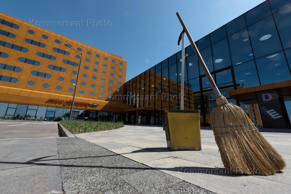 Подготовка к открытию Петербургского международного экономического форума (ПМЭФ)- 2016. Новая площадка ПМЭФ-2016 — Конгрессно-выставочный центр "Экспофорум". Жанровая фотография. Совок и метла для уборки мусора.