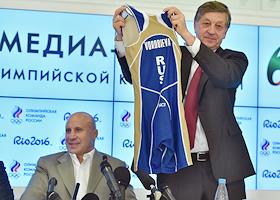 Президент Федерации спортивной борьбы России, вице-президент Олимпийского комитета России Михаил Мамиашвили (слева) и директор-руководитель главного управления по обеспечению участия в Олимпийских спортивных мероприятиях ОКР Игорь Казиков (справа) во время пресс-конференции, посвященной подготовке национальной сборной по вольной борьбе к Олимпийским играм в Рио-де-Жанейро. Пресс-конференция прошла в Инновационном центре Олимпийского комитета России.