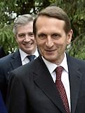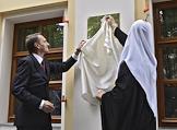 Председатель Государственной думы России, председатель Российского исторического общества Сергей Нарышкин (слева) и Святейший Патриарх Московский и всея Руси Кирилл (справа) во время церемонии открытия Дома Российского исторического общества, приуроченной к 150-летию основания этой организации.