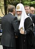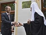 Председатель Государственной думы России, председатель Российского исторического общества Сергей Нарышкин (слева) и Святейший Патриарх Московский и всея Руси Кирилл (в центре) во время церемонии открытия Дома Российского исторического общества, приуроченной к 150-летию основания этой организации.