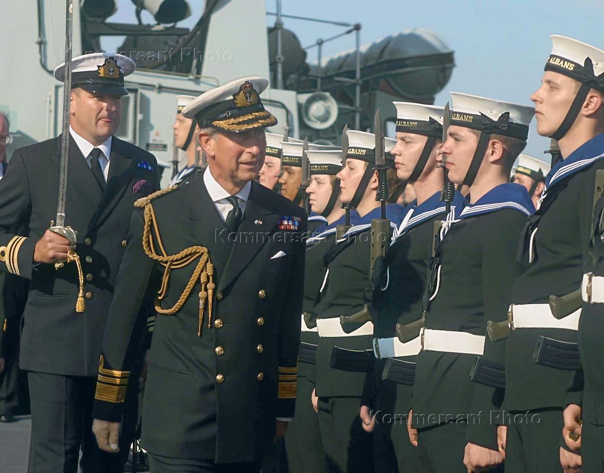 The British crown prince - Charles, Prince of Wales (centre) walks along the line of British sailors standing in attention aboard HMS St.Albans during the ceremony of handing over the training yacht Adventure to the Russian navy as a gift from the British royal family.