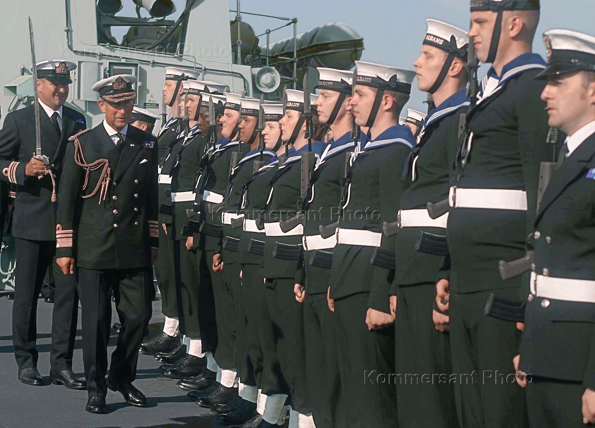 Наследник британского престола Принц Уэльский Чарльз на борту фрегата "Сент Олбанс" во время торжественного приема по случаю передачи российскому флоту дара Королевского ВМФ Великобритании - учебной парусной яхты "Адвенчер".